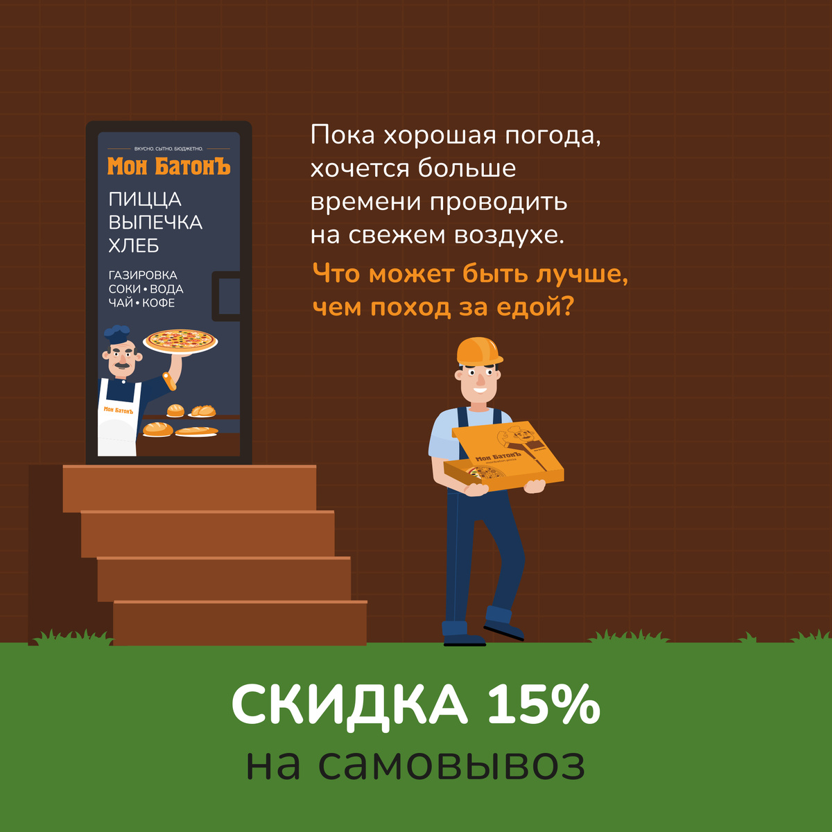 Предоставляем скидку 15% на самовывоз пиццы по промокоду! Так Вам будет гораздо интереснее гулять, ведь этот поход — за едой! Условия акции:
