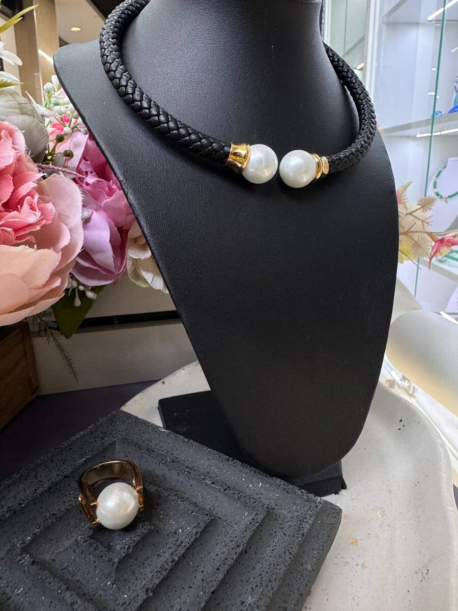 Нестандартный дуэт, притягивающий взгляды: выразительная кожа и благородный перламутр объединены в этом уникальном колье и кольце