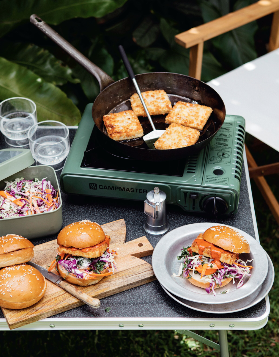4. Смешиваем капустный салат с майонезом в миске. Ну, это чтобы совесть не мучила за то, что вы едите только жареную гадость. Делим эту смесь пополам, выкладываем на нижние половинки булочек, сверху кладем пару кусочков тофу, немного шрирачи (или нашей ядреной горчицы!) и накрываем верхней булочкой. И вуаля! «Шедевр» готов!