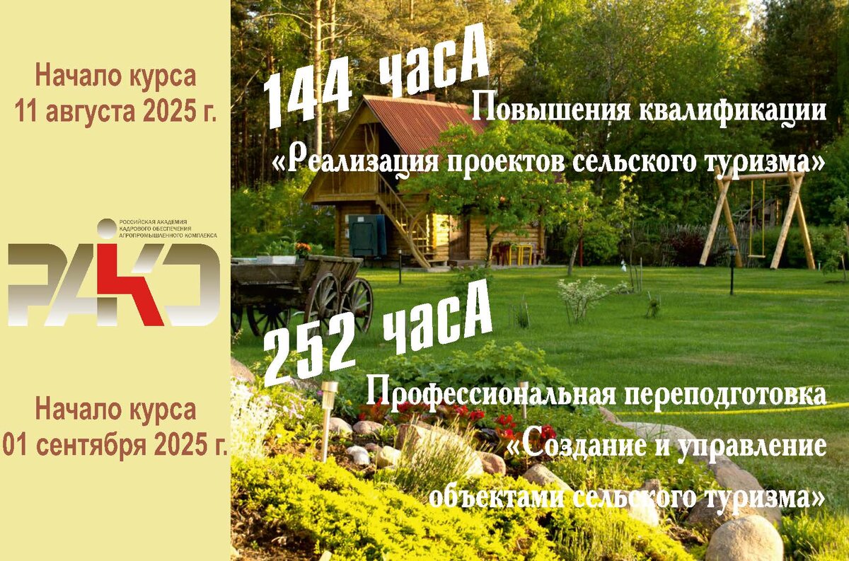 В ближайшее время стартуют программы повышения квалификации «Реализация проектов сельского туризма» 144 часа (для тех, кто уже выиграл грант и реализует проект агротуризма) Начало курса 11 августа 2025 г. и профессиональной переподготовки «Создание и управление объектами сельского туризма». 252 часа (для тех, кто только планирует создать объект агротуризма) Начало курса 01 сентября 2025 г. Обучение пройдет с привлечением сетевых партнеров. В регионы проекта входят г. Москва, Ставропольский край, г. Нижний Новгород, Иркутская область и Республика Северная Осетия- Алания. Это не будут скучные лекции. Каждое занятие — шаг к решению конкретных задач: почему не едут гости, как повысить доход, что делать с персоналом, как рекламироваться, как развивать — не вслепую, а с расчётом. Слушатели пройдут этот путь не одни, а вместе с наставниками, такими же, как и вы — упёртыми, настойчивыми, настоящими! Пока есть бюджетные места! Записаться на программы (Заполните анкету и предварительно запишитес