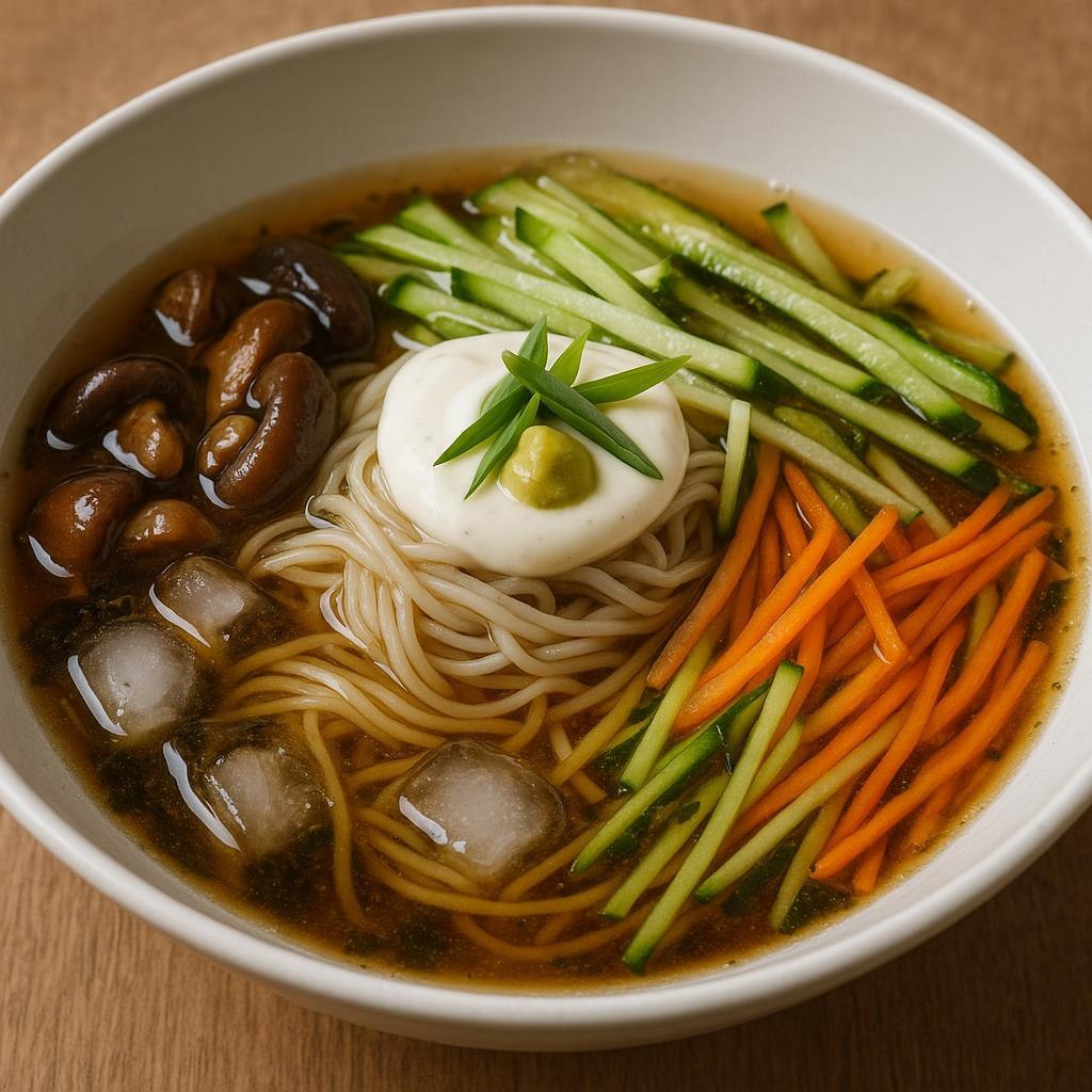 Лето — пора, когда хочется лёгкости, свежести и новых вкусов. Приготовьте холодный корейский суп с лапшой «Куксу» — это идеальный быстрый и освежающий рецепт для жарких дней, вегетарианского ужина или экспресс-обеда. Здесь прекрасно всё: кисло-сладкий бульон, хрустящие овощи и неожиданные корейские акценты. Этот суп полюбят даже те, кто раньше сомневался в азиатской кухне. Получите максимум вкуса и свежести за минимум времени! Насладитесь сочной лапшой и ярким бульоном — ничего лишнего. Готовьте, пробуйте, удивляйте! на 2-3 порции Для бульона: – Возьмите 1,5 л чистой фильтрованной воды (можно с кубиками льда) – Нарежьте крупный огурец соломкой – Нарежьте 1/2 сочной редьки дайкон (или обычную белую редьку) – Нарежьте 1/2 зелёного кисло-сладкого яблока – Добавьте 4-5 см водоросли комбу (или замените щепоткой нори и чуть большим количеством соли) – Влейте 3-4 ст. л. соевого соуса – Добавьте 2 ст. л. рисового уксуса – Всыпьте 1 ст. л. тростникового или кленового сир