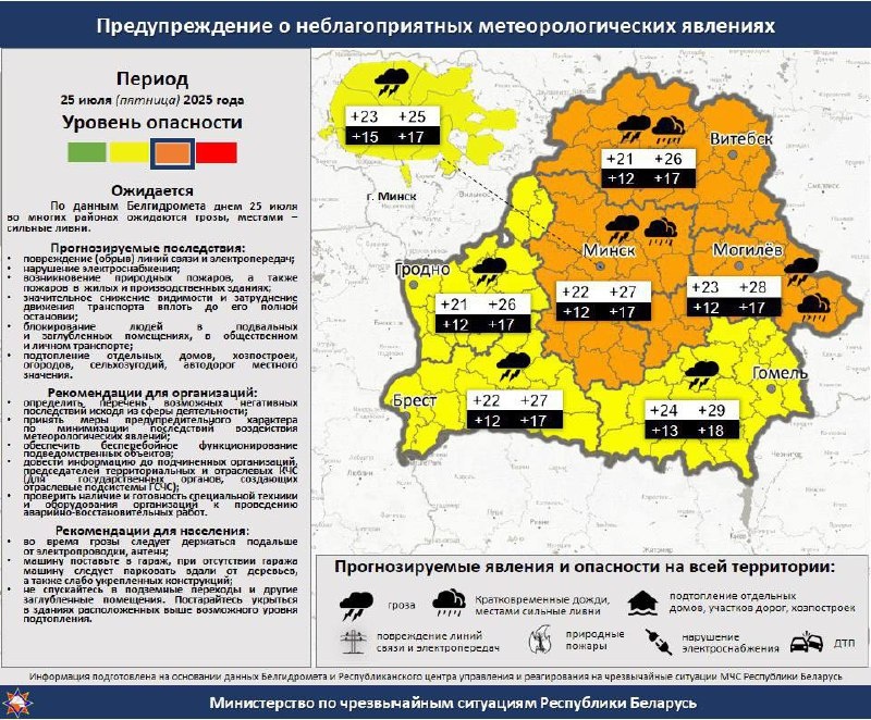 ☝️Оранжевый уровень опасности объявлен на территории Витебской области 25 июля из-за гроз и сильных ливней.