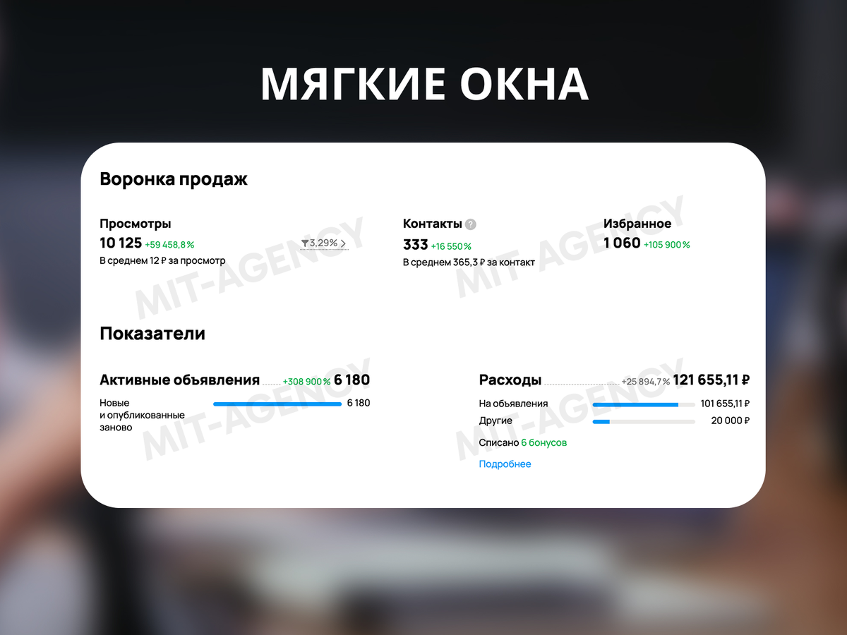 Всем привет! MIT Agency - эксперты по рекламе на Авито, которая действительно приносит заявки. Делимся еще одним успешным кейсом в нише мягких окон - от первых шагов до 333 контактов за 4 месяца. ⏳ Время чтения: 4 минуты Клиент - производитель мягких окон. Они делают всё под ключ: замер, изготовление и установка. Работают с частными домами, верандами, террасами и тд. До нас Авито не тестировали. Особое внимание рекомендуем уделить визуальной части. Мы всегда ЗА использование инфографики, но в этой нише лучше сработают реальные фото объектов, процесса установки, до/после. Мы отказались от инфографики, потому что она не давала нужной вовлеченности. 1. Создали уникальные объявления под каждый запрос Кто-то хочет утеплить кафе, кто-то - просто укрыться от дождя, и продлить дачный сезон. Поэтому мы: – Адаптировали тексты под цели клиентов.