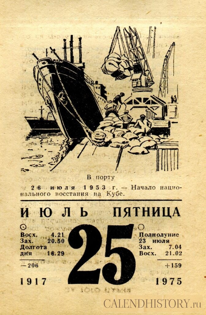 Итак, сегодня 25-го июля и у нас на календаре 1975-й год. Перед нами листок советского календаря для женщин. На календаре у нас пятница - 25 июля 1975-го года. В порту 26 июля 1953 г. — Начало национального восстания на Кубе. *** Оборотную сторону листка этого календаря можно посмотреть у нас по ссылке на сайте. Другие листки советских календарей смотрите у нас на сайте - CALENDHISTORY.ru ПОСМОТРИТЕ ЕЩЁ ЛИСТКИ ОТРЫВНЫХ КАЛЕНДАРЕЙ: