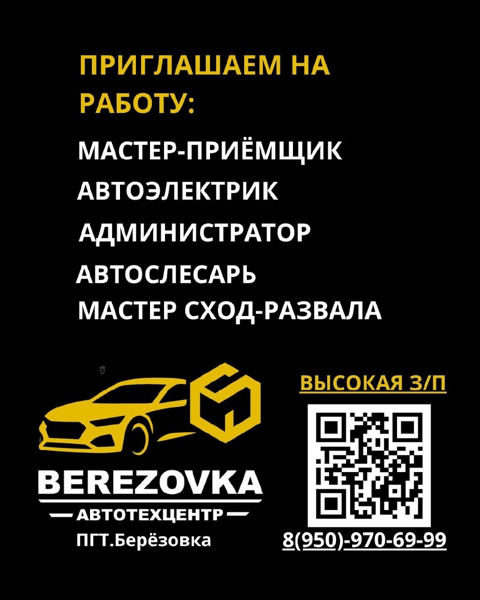 🚗 АВТОТЕХЦЕНТР В БЕРЕЗОВКЕ ИЩЕТ СОТРУДНИКОВ! 🔧 В связи с открытием нового автотехцентра в пгт. Березовка приглашаем в команду: 🔹 Мастер-приёмщик 🔹 Автослесарь 🔹 Автоэлектрик 🔹 Мастер сход-развала 🔹 Администратор 💼 Мы предлагаем: ✅ Стабильную и достойную заработную плату ✅ Современное оборудование ✅ Дружный коллектив 📍 Рабочее место — пгт. Березовка 📞 Все подробности по телефону:89509706999 📩 Или пишите в личные сообщения https://vk.com/sadovskaia_kris Будем рады видеть вас в нашей команде! #вакансии #Березовка #работа #автосервис #автотехцентр #ищемсотрудников