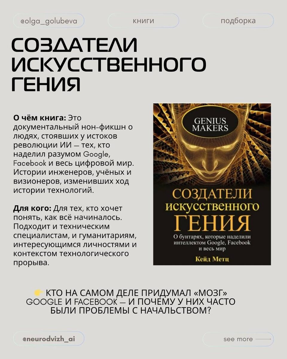 1."Создатели искусственного гения. О бунтарях, которые наделили интеллектом Google, Facebook и весь мир". - Кейт Метц . По этой книге можно снять фильм!🍿Настолько интересна история борьбы, участия Маска , Microsoft, Google и опоздавшего FB в гонке за людьми и технологиями и на самом деле небольшом количестве гениальный ученых, которые создали историю.