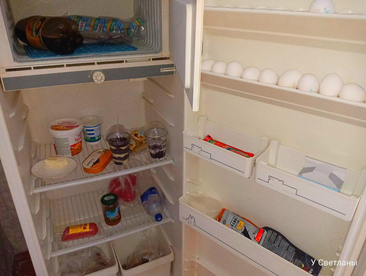 Яйца, помидоры, колбаска копчёная, тортики в стаканах из Пятигорска, привезённые вчера. Также есть шпроты, правда, они никак не лезут в такую-то жару, не знаю зачем мы их купили, их хорошо есть в прохладную погоду, а никак не в эту.