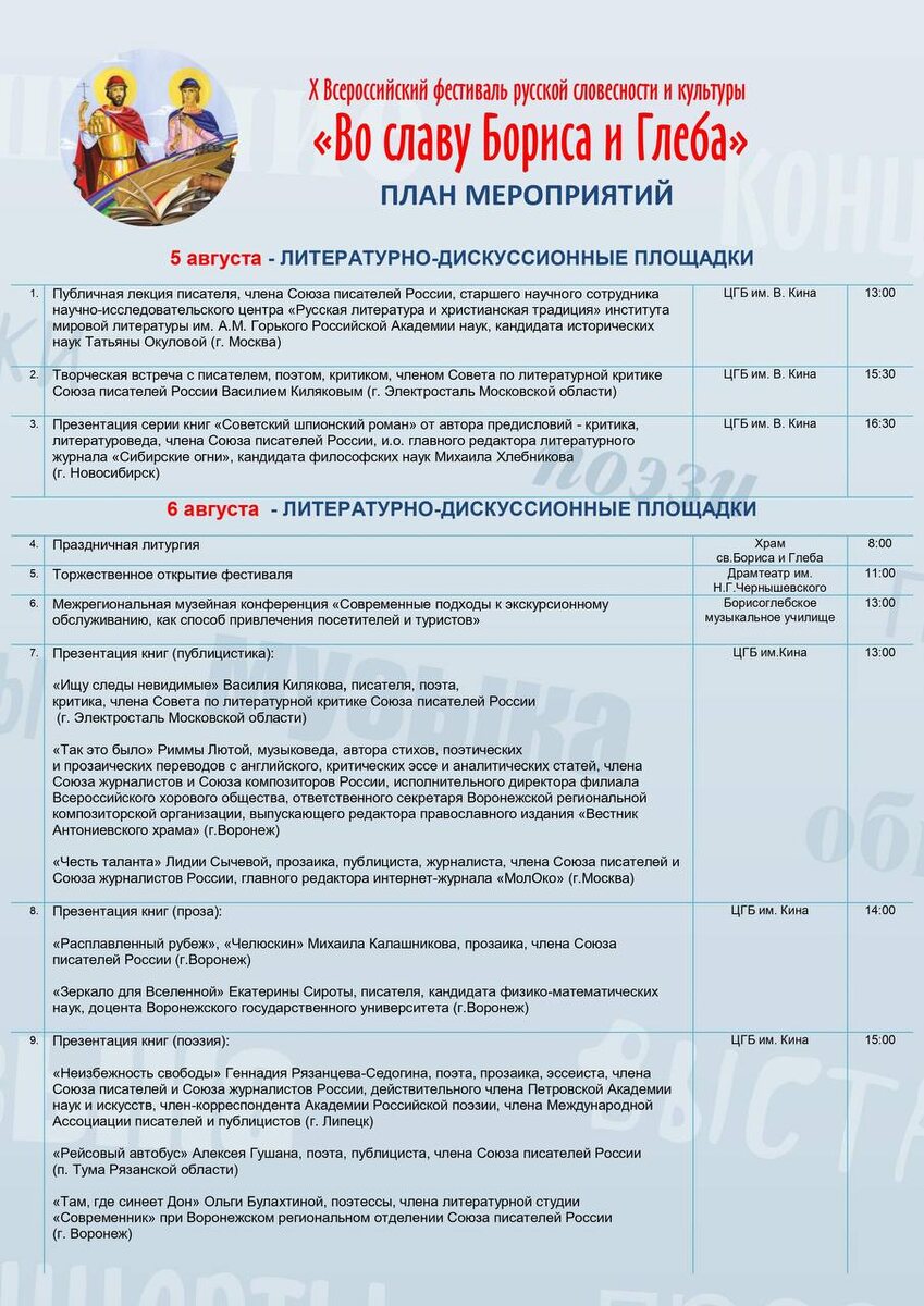 Афиша мероприятий X Всероссийского фестиваля русской словесности и культуры "Во славу Бориса И Глеба"