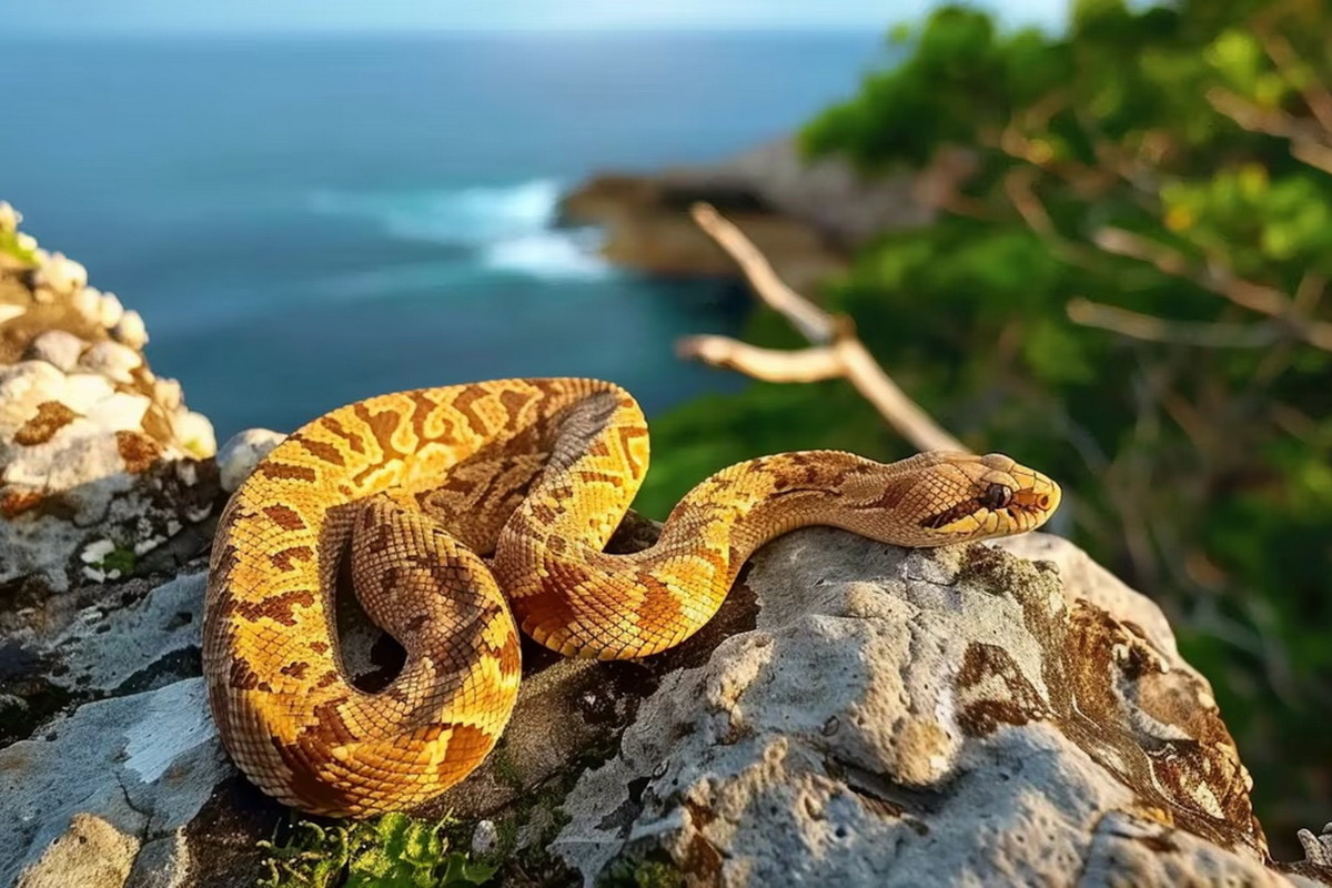 Начнем с фактов. Остров под названием Илья-да-Кеймада-Гранди действительно существует и расположен у юго-восточного побережья Бразилии. Площадь этого клочка вполне симпатичной суши – менее половины квадратного километра, и именно он стал домом для уникального вида пресмыкающихся — островного ботропса (Bothrops insularis), или золотой копьеголовой гадюки. Эти змеи считаются одними из самых ядовитых в Южной Америке.