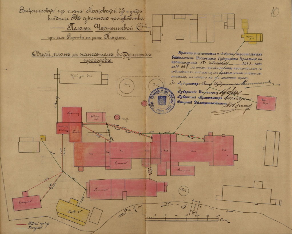 Он цитирует архивные документы о том, что планы пристроить электростанцию к фабрике запланировали в 1898 году. Но что-то там всё не срасталось, медленно шла стройка, хотя чего там было так много и долго строить (узнаете об этом ниже). Только аж в 1913 году, когда уже воздух Москвы и Питера всё больше наэлектризовывался от политической нестабильности и грядущих революций, потомки Пелагеи Чернышёвой подготовили схему электрификации самой фабрики и нескольких жилых домов для рабочих. Данную схему я стыбрю, да не осудит меня автор! Авторство себе не присваиваю: