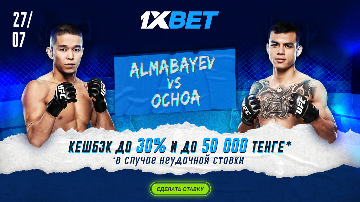 Асу Алмабаев – Хосе Очоа Любите смешанные единоборства? Ударная акция для всех поклонников боев MMA! Каждая ваша ставка на поединки в UFC будет защищена! Компания 1XBET предлагает поддержать своего фаворита и получить до 50 000 тенге и кэшбэк до 30% в случае проигрыша. Чтобы участвовать в акции «1x Punch» необходимо зарегистрироваться на сайте компании и сделать одиночную ставку на маркет «П1 Х П2» по линии/ Live на сумму от 5000 KZT на бой, представленный на сайте 1XBET или в приложении. Учитывается только первая ставка на бой. Если ставка одиночная и она проиграет – вы получите бонус, соответствующий проценту ( согласно градации) от первоначальной ставки. Если ваша первая ставка на этот бой выиграет, бонус в таком случае не зачислиться. Максимальная сумма возврата 50 000 тенге. Делайте ставки на бой и болейте за своих фаворитов вместе с главным спонсором спортивных эмоций 1XBET!