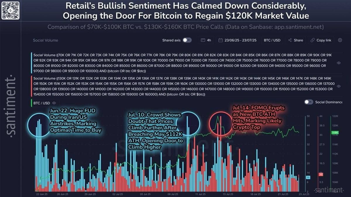 Бычьи настроения частных инвесторов в #BTC заметно снизились. Исторически bullish. — отмечают эксперты Santiment.