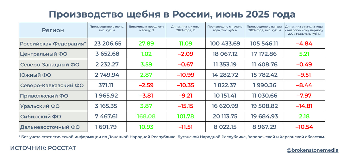 Росстат опубликовал данные по производству щебня в июне 2025 года. За месяц в России получено 23,2 млн куб. м (32,5 млн тонн). По отношению к июню 2024 года производство щебня в стране увеличилось на 11%. Причём положительную динамику обеспечил единственный федеральный округ — Сибирский. Здесь зафиксирован значительный прирост — более 101%. Во всех остальных федеральных округах отмечено снижение производства по отношению к июню 2024 года. Наиболее сильное падение производственных показателей произошло на предприятиях в Уральском (–15,2%), Дальневосточном (–11,5%), Южном (–11%) и Северо-Кавказском (–10,4%) федеральных округах. Наибольшие объемы щебня в июне 2025 года получены в Сибирском, Центральном и Уральском федеральных округах. В Сибирском федеральном округе рост по отношению к прошлому месяцу составил 168%. На 10% выросло производство на Дальнем Востоке. Отрицательную динамику к прошлому месяцу показали Приволжский и Северо-Кавказский федеральные округа: –3,8% и –2,6% соответстве