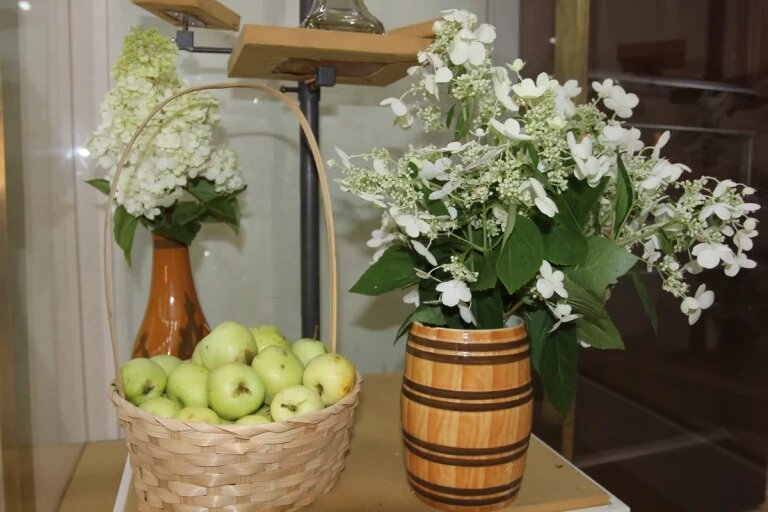 Участники клуба «Добрые плоды», действующего при библиотеке имени Белинского, привезли сюда яркие букеты со своих участков: лилии, флоксы, розы, гортензии, монарду и другие цветы, превратив зал в сад.
