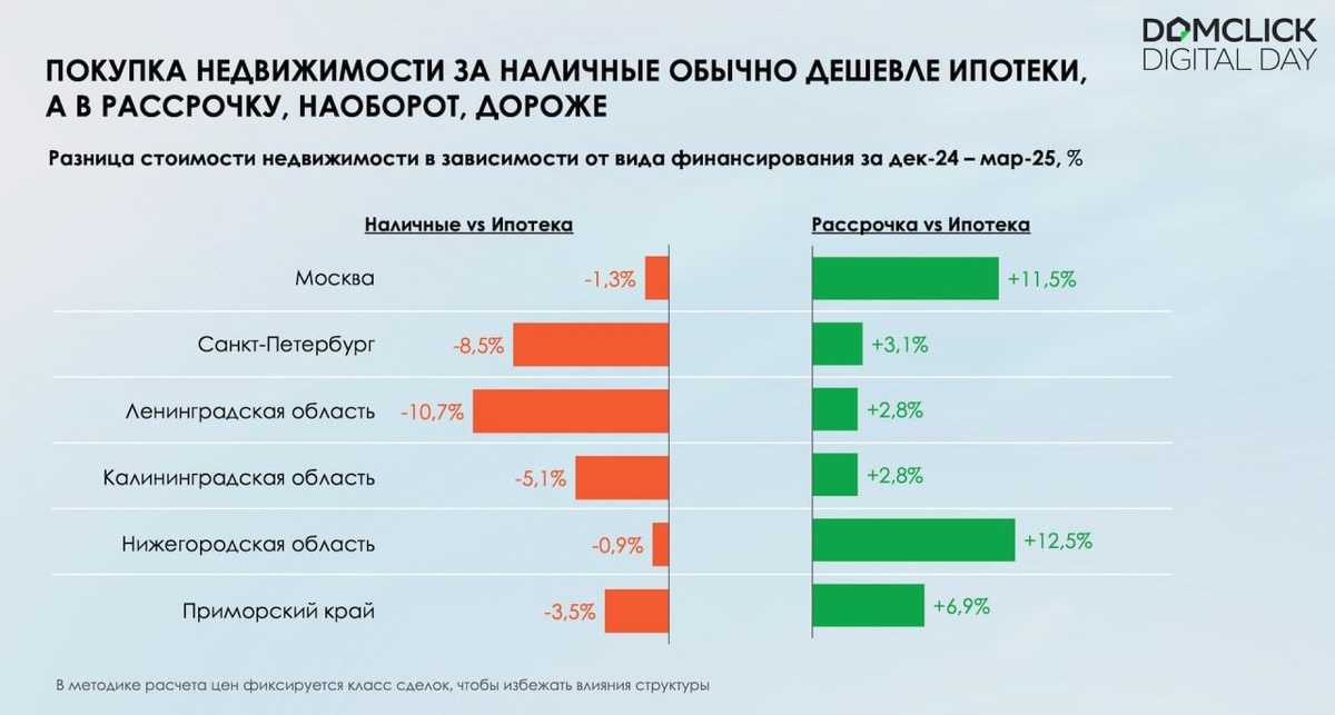 , Π³Π΄Π΅ ΠΏΡΠ΅Π²Π°Π»ΠΈΡΡΠ΅Ρ ΡΡΠ½ΠΎΠΊ ΠΏΡΠ΅Π΄Π»ΠΎΠΆΠ΅Π½ΠΈΡ β Π½Π°ΠΏΡΠΈΠΌΠ΅Ρ, ΠΠΎΡΠΊΠ²Π° β ΡΠΎ Π·Π΄Π΅ΡΡ Π·Π° Π½Π°Π»ΠΈΡΠ½ΡΠ΅ ΠΊΡΠΏΠΈΡΡ ΠΊΠ²Π°ΡΡΠΈΡΡ Π² Π½ΠΎΠ²ΠΎΡΡΡΠΎΠΉΠΊΠ΅ ΠΌΠΎΠΆΠ½ΠΎ Π½Π΅ΠΌΠ½ΠΎΠ³ΠΎ Π΄Π΅ΡΠ΅Π²Π»Π΅, ΡΠ΅ΠΌ Π² ΠΈΠΏΠΎΡΠ΅ΠΊΡ. ΠΠΎ ΡΠΊΠΈΠ΄ΠΊΠ° Π½Π° ΠΊΠ²Π°Π΄ΡΠ°ΡΠ½ΡΠΉ ΠΌΠ΅ΡΡ Π½Π΅ Π±ΡΠ΄Π΅Ρ Π±ΠΎΠ»ΡΡΠΎΠΉ β ΠΎΠΊΠΎΠ»ΠΎ 1,3%. Π Π²ΠΎΡ Π·Π° ΡΠ°ΡΡΡΠΎΡΠΊΡ ΠΏΡΠΈΠ΄Π΅ΡΡΡ Π·Π°ΠΏΠ»Π°ΡΠΈΡΡ [ΠΏΡΠΈΠΌ. ΡΠ΅Π΄. β Π² ΠΠΎΡΠΊΠ²Π΅ ΠΏΠΎΠΊΡΠΏΠΊΠ° Π½Π΅Π΄Π²ΠΈΠΆΠΈΠΌΠΎΡΡΠΈ Π² ΠΈΠΏΠΎΡΠ΅ΠΊΡ ΠΌΠΎΠΆΠ΅Ρ ΠΎΠ±ΠΎΠΉΡΠΈΡΡ Π² ΡΡΠ΅Π΄Π½Π΅ΠΌ Π½Π° 11,5% Π΄Π΅ΡΠ΅Π²Π»Π΅, ΡΠ΅ΠΌ Π² ΡΠ°ΡΡΡΠΎΡΠΊΡ]. ΠΡΠ»ΠΈ ΡΠ°ΡΡΠΌΠΎΡΡΠ΅ΡΡ Π‘Π°Π½ΠΊΡ-ΠΠ΅ΡΠ΅ΡΠ±ΡΡΠ³ ΠΈ ΠΠ΅Π½ΠΎΠ±Π»Π°ΡΡΡ, ΡΠΎ Π·Π΄Π΅ΡΡ ΠΌΡ Π²ΠΈΠ΄ΠΈΠΌ, ΡΡΠΎ Π·Π° Π½Π°Π»ΠΈΡΠ½ΡΠ΅ ΠΌΠΎΠΆΠ½ΠΎ ΠΏΠΎΠ»ΡΡΠΈΡΡ Π±ΠΎΠ»ΡΡΠΈΠ΅ ΡΠΊΠΈΠ΄ΠΊΠΈ, Π° ΡΠ°ΡΡΡΠΎΡΠΊΠΈ Π²ΡΠ΄Π°ΡΡΡΡ Π±ΠΎΠ»Π΅Π΅-ΠΌΠ΅Π½Π΅Π΅ Π±Π΅ΡΠΏΠ»Π°ΡΠ½ΠΎ. Π’