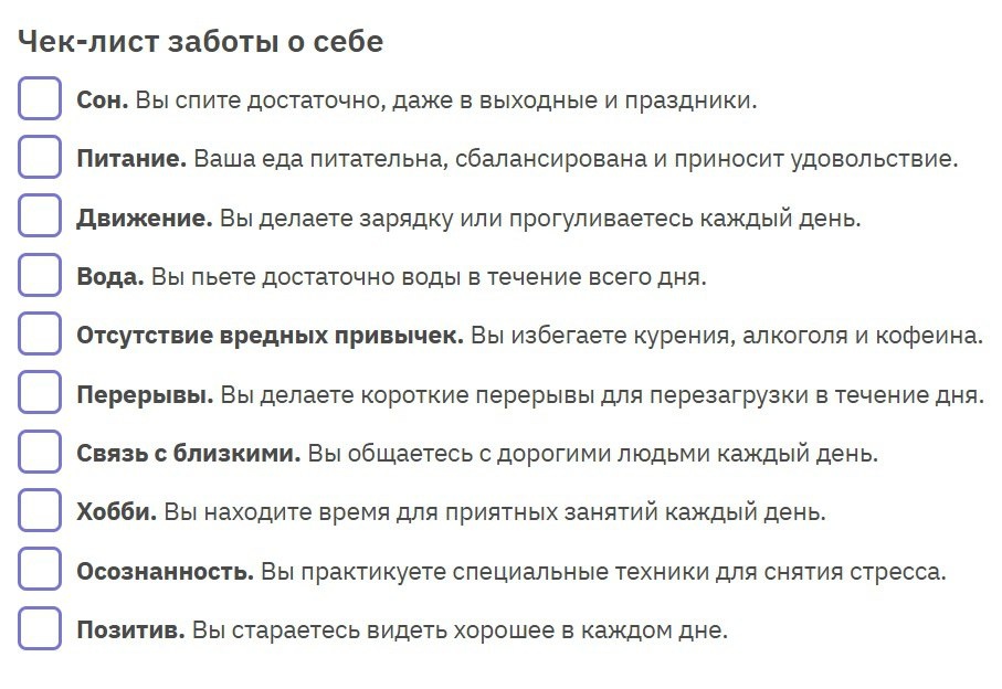 24 июля – День заботы о себе. Дата этого праздника содержит намёк – 24 число 7 месяца говорят о том, что заботиться о себе нужно 24 часа 7 дней в неделю. Такой смысл в праздник вложил организатор – Международный фонд заботы о себе (да-да, есть и такой). Проверьте, насколько искренне вы заботитесь о себе по следующему чек-листу (см. рисунок). Мне сложнее всего даётся номер 8. А вам? #заботаосебе #чек-лист