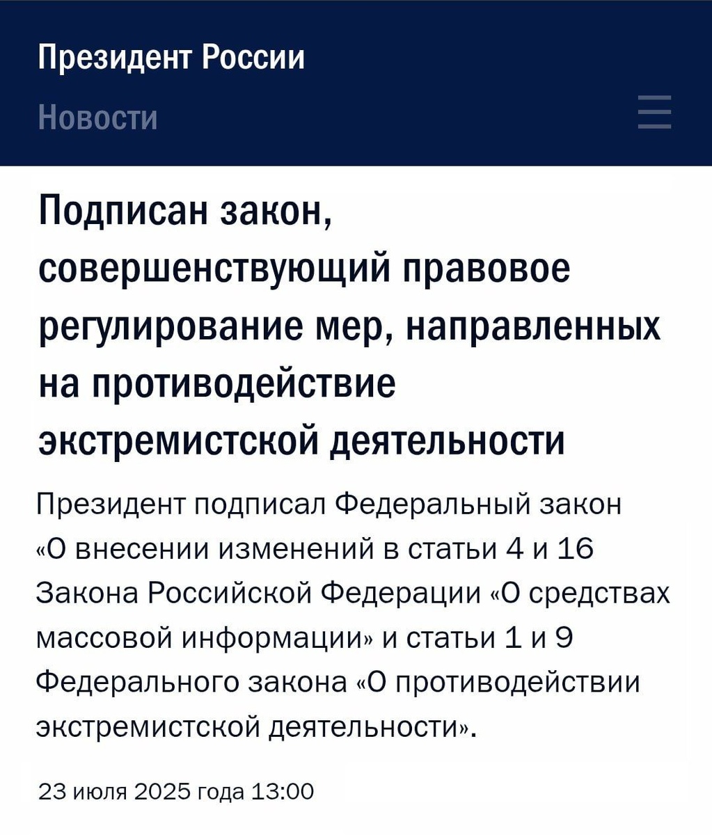 Стать экстремистом в России теперь ПРОЩЕ ПРОСТОГО — Путин подписал закон, который в разы ускоряет признание сообщества или человека экстремистом. Мы внимательно изучили документ. Формулировки размытые и от этого еще страшнее: • За экстремизм теперь будут отправлять на зону ТОЛЬКО ПО РЕШЕНИЮ СУДА — не нужно даже официальное попадание в список Минюста. Приговор — и на кичу. • Закон теперь распространяется на юрлица и даже неофициальные группы — в теории, даже ваш домовой чат или стак в CS могут признать экстремистами. • Хуже всего — создателю сообщества. Он автоматически попадает под ответственность, даже если не транслировал экстремистские взгляды. • Остальные участники могут жестко попасть в разработку силовиков, если сообщество признают экстремистским и будет доказана причастность к нему. Изменения в законы о СМИ и экстремизме уже ВНЕСЛИ — время чистить ваши группы и чаты. Страшно.
