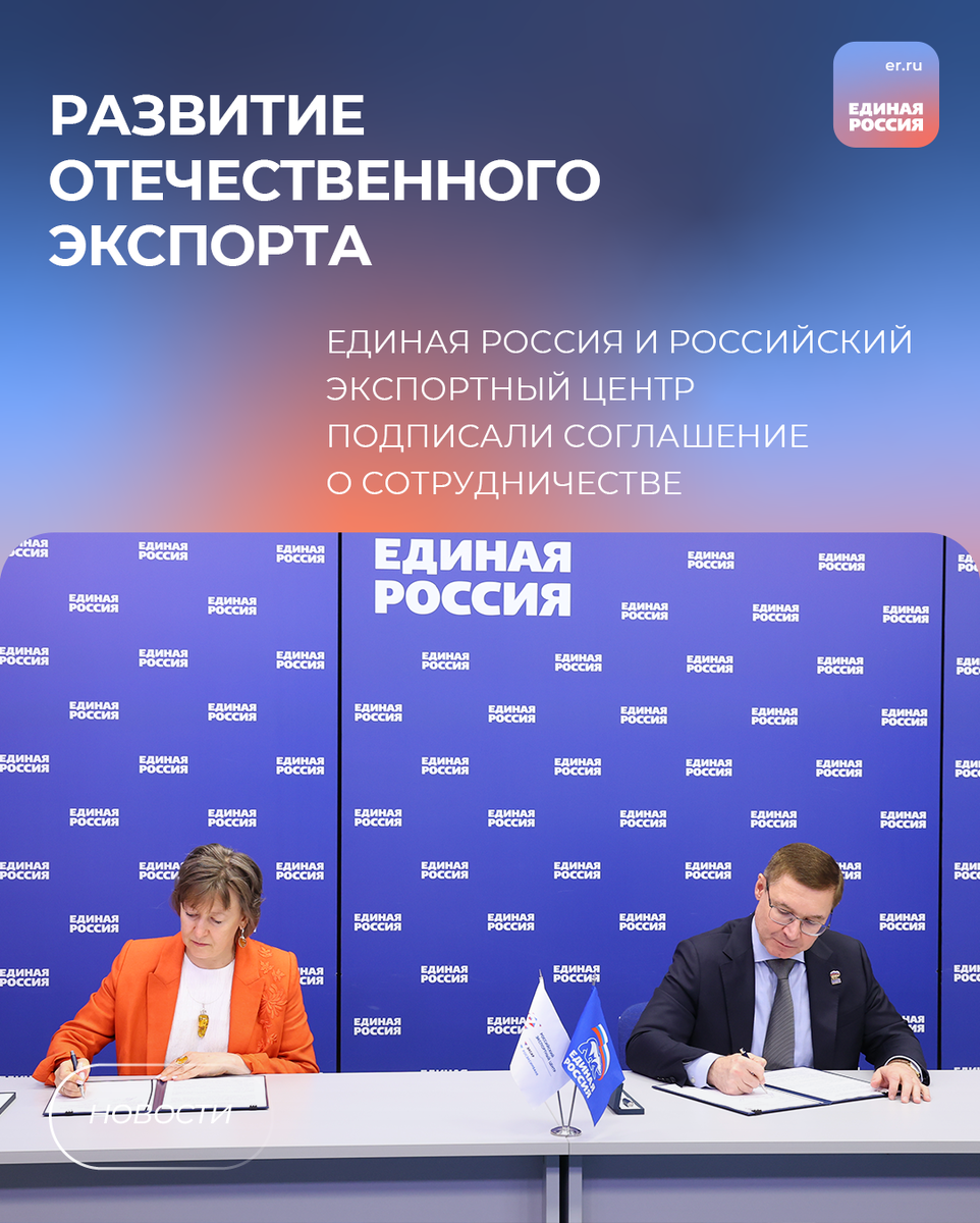 ✅ Единая Россия и Российский экспортный центр (РЭЦ) будут вместе продвигать российскую продукцию за рубежом – она производится под национальным брендом «Сделано в России» 📝 Соответствующее соглашение о сотрудничестве подписано сегодня между партией и РЭЦ (Группа ВЭБ). Его цель — рост несырьевого неэнергетического экспорта к 2030 году как минимум на две трети по сравнению с 2023 годом. «Сегодня Россия может претендовать на глобальное лидерство в самых разных сферах – от производства органического продовольствия до беспилотных систем. Для этого надо эффективно защищать внутренний рынок, поддерживать отечественных производителей. Создавать им все условия для роста и выхода на международные рынки. Вместе Единая Россия и Российский экспортный центр могут больше сделать по всем этим направлениям», – сказал Владимир Якушев. #ЕдинаяРоссия