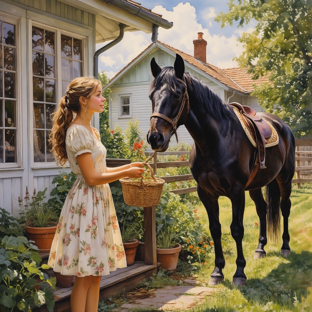 Мы подкрались к её дому и спрятались за забором. Марина ждала у дороги с лошадью по кличке Гроза— высокой, вороной, с белой звездой на лбу. На шее у неё висел наш подарок— корзинка с тремя записками-подсказками, ведущими к спрятанному сюрпризу.