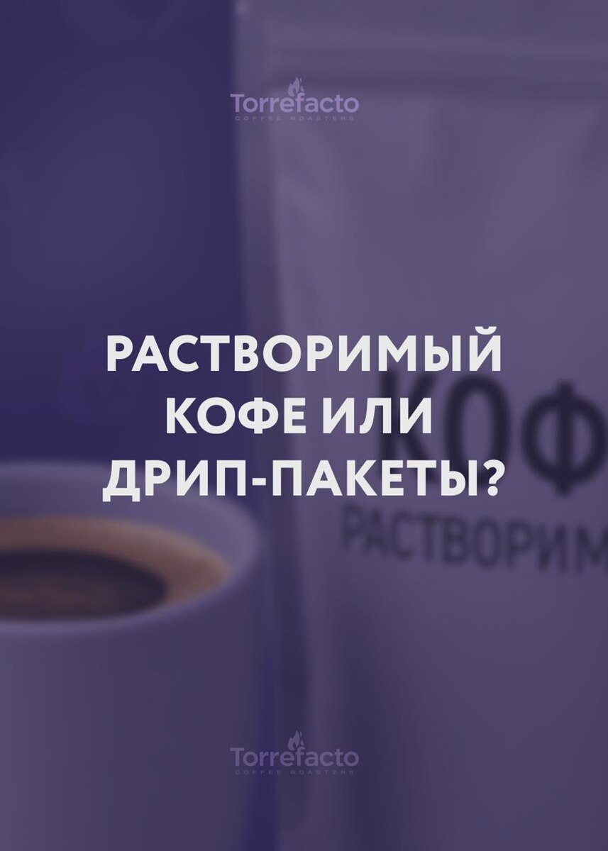 Растворимый кофе или дрип-пакеты? Сегодня, в день рождения растворимого кофе, предлагаем отправиться в небольшое путешествие от зерна до чашки. А затем сравним, чем растворимый кофе отличается от кофе в дрип-пакетах, чтобы помочь вам выбрать комфортный и вкусный для себя вариант. 🤔 Как производят растворимый кофе? Путь начинается с классической обжарки – обычно смеси арабики с робустой, – после чего ароматные зёрна перемалывают. А дальше – молотый кофе несколько раз варят в горячей водой, чтобы получить очень насыщенный настой (экстракт). На этом этапе и происходит «первичное заваривание». Полученный концентрат затем превращается в знакомый нам порошок с помощью спрей-драйинга (распыления его в камере с очень высокой t° до выпаривания влаги) или более бережного фриз-драйинга (заморозка экстракта и высушивание в вакууме). В некоторых случаях гранулы «склеивают» паром, чтобы они быстрее растворялись, а после — фасуют в банки и саше в азотной среде, сохраняя вкус и аромат на неск