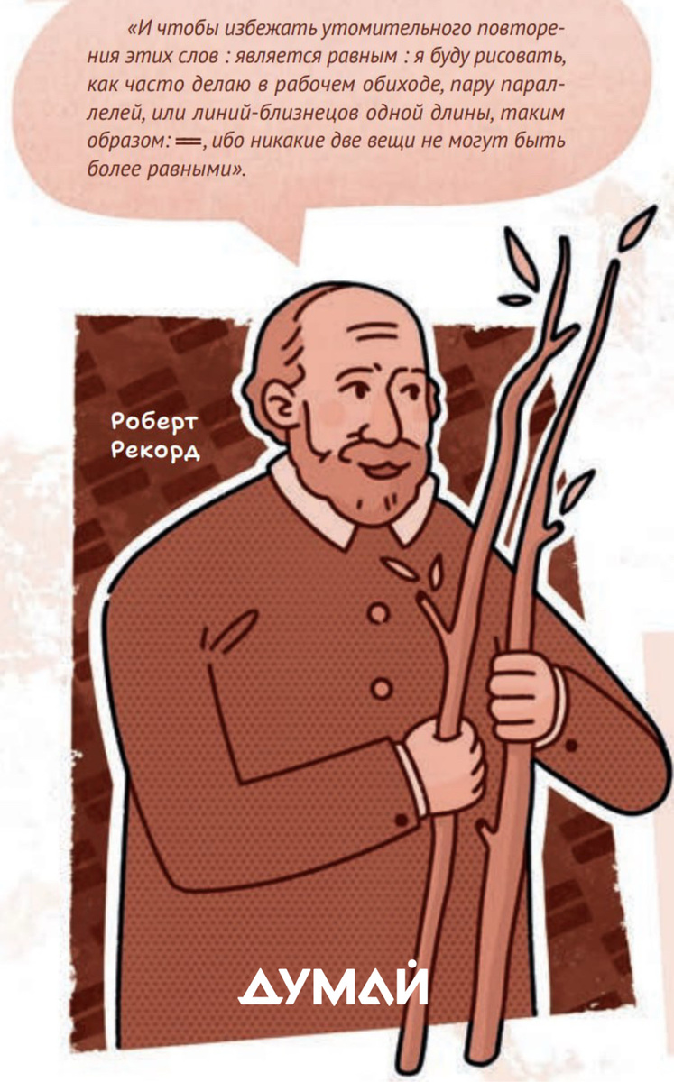 ⚔️ В средневековой математике равенство прописывали словами est egale (лат. «это равно»). ✏️ Французский философ и математик Рене Декарт, тот самый, который придумал оси координат, вместо знака равенства писал лигатуру æ (от лат. aequalis «равный»). 🟰 Знак равенства, близкий к современному, был предложен валлийским математиком Робертом Рекордом только в 1557 году. Но линии в знаке Рекорда были гораздо длиннее современных. Для равенства математик позаимствовал символ параллельных линий, широко использовавшийся в геометрии того времени. Довод, который Рекорд приводит на картинке – из его математической работы, замечательной уже своим названием: «Точильный камень остроумия». Из журнала ДУМАЙ №10, октябрь 2024 🚀ВЫТАЩИ РЕБЕНКА ИЗ ГАДЖЕТА! Оформить подписку на наш бумажный журнал ДУМАЙ с текущего месяца (июля) можно на сайте редакции www.dum.ai 🙌🏻 Доставка входит в стоимость. Журналы приходят ежемесячно, прямо к вам в почтовый ящик. Подписывайся на наш телеграмм канал, совсем скор