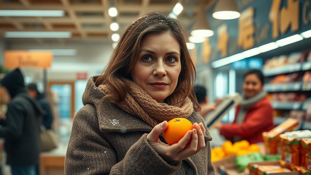 Раннее морозное утро. На полу у входа — свежая пороша, хлопья успели прилипнуть к капюшону моего пуховика. Людей мало. У кассы работает Ольга — светлый объёмный свитер, быстрая улыбка. По залу тянутся скрипы тележек, слышен тихий писк сканера — звуки кажутся глуше обычного. Лампы режут белым светом пакеты и россыпи фруктов, подчёркивая их оранжевую «солнечность» на фоне серых стен.