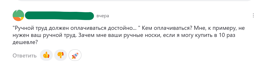 Мне приходит очень много комментариев под статьями. Так много, что не успеваю читать всё, а уж тем более отвечать. Но иногда пишут такие, мимо которых пройти просто не могу. Честно сказано, без лукавства. И главное, человек прав. Ему не нужны носки ручной работы. И в этом нет ничего странного. Не всем это надо, не всем это близко. Ровно как кому-то не нужна глиняная кружка, если в магазине напротив продаются стаканы по 50 рублей. Кому-то не нужно масло от фермера, если есть растительный спред по акции. Кому-то не нужна книга в твёрдом переплёте, если есть PDF бесплатно. Содержание ведь одинаковое, буквы те же. Всё, что перечислено, — личный выбор. Не вкусовщина и не вредность. Просто так устроено потребление: одни выбирают одно, другие — другое, третьи — третье. Вопрос стоит не в нужде, а в личном выборе. А ручная работа — это товар далеко не первой необходимости. Это не хлеб, не лекарства, не отопление. Это не про выживание. Это про чувство вкуса, про уважение к вещам, про отношени