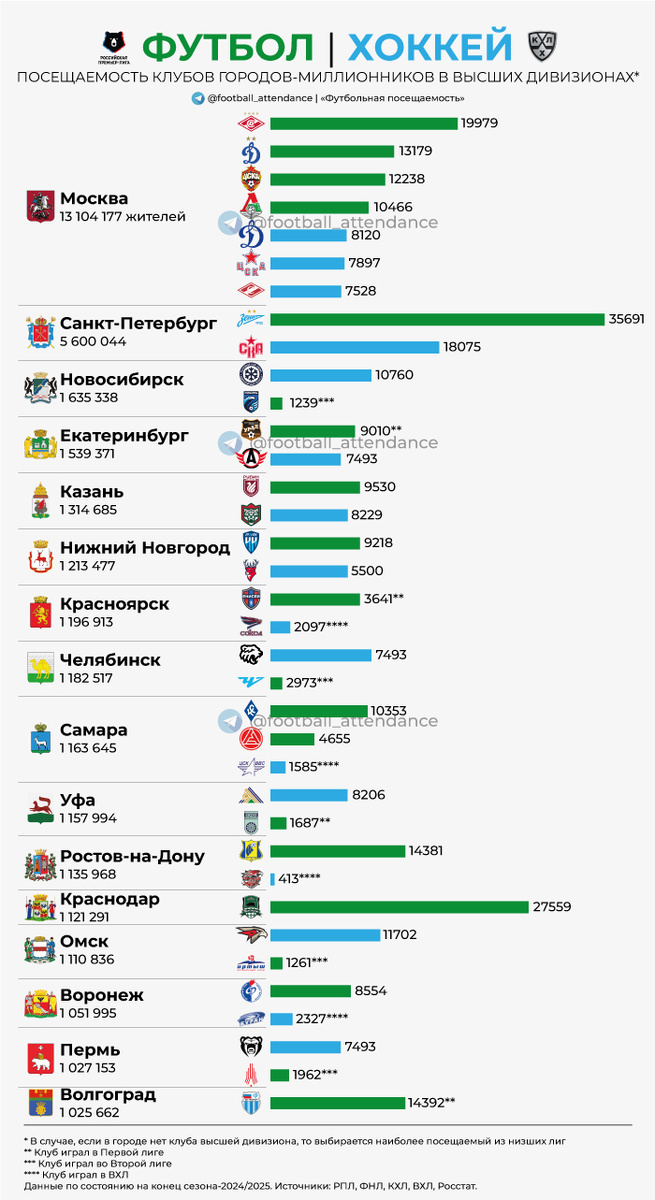Подготовил сравнение средней аудитории на футболе и хоккее по итогам прошлого сезона. Пока что только в самых крупных городах с населением свыше миллиона жителей. В первую очередь сравнивал посещаемость клубов, которые играют в высших дивизионах своих видов спорта: РПЛ и КХЛ.