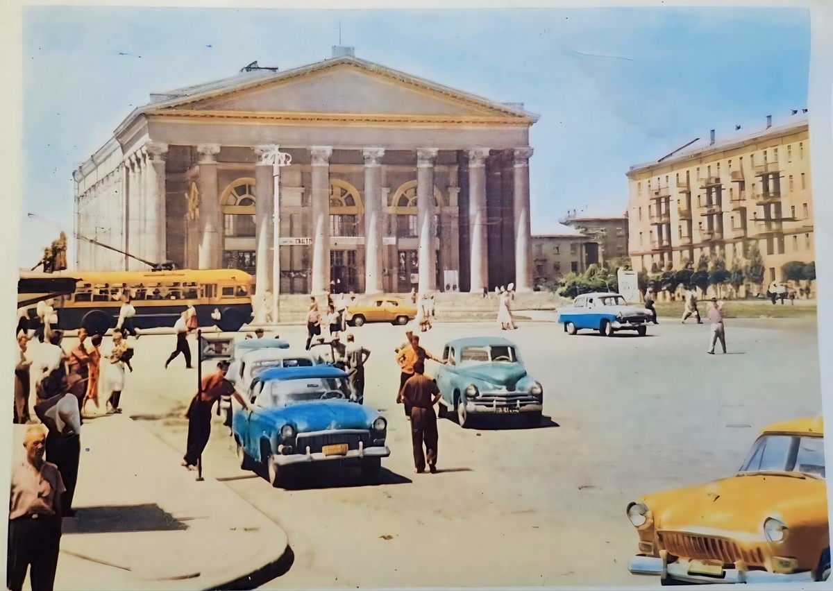 Донецкая группа новостей|Донецк.ДНР (VK) Донецк. Областной драматический театр. Стоянка такси на проспекте Гринкевича, будущей площади Ленина. 1963 год https://t.me/webmoney_dn/294524