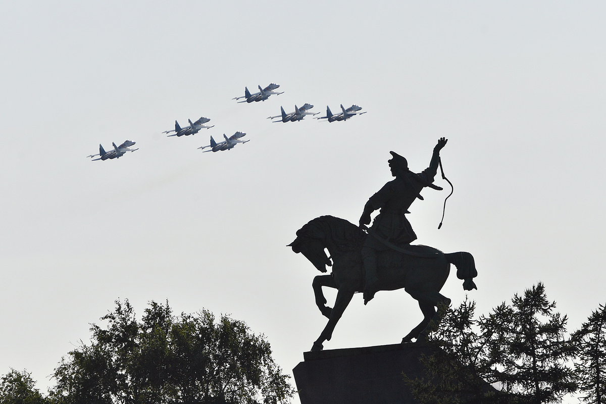 В честь 100-летия УМПО легендарная пилотажная группа представила зрителям впечатляющее авиационное шоу. Над этнопарком «Ватан» кружили истребители, оснащенные двигателями, разработанными и изготовленными на предприятии-юбиляре.