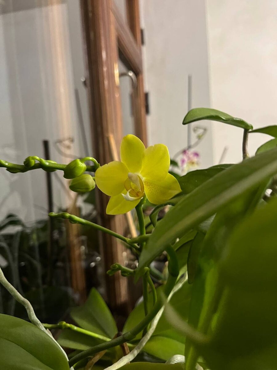 Пока я уехала на запад, расцвела одна из любимых орхидей Желтый фаленопсис мультифлора Был подарен на Новый год, потом пытался умереть, но после переезда в мох решил жить💀 Так что праздную первое домашнее цветение💐