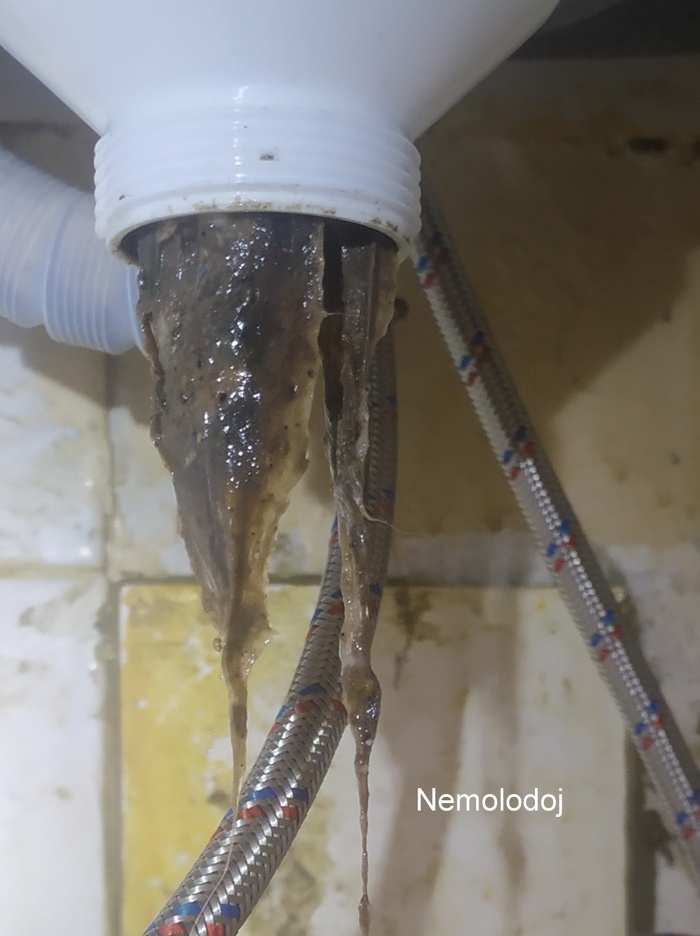 Давно задумал этот пост, и ждал несколько месяцев, пока в кухонной мойке не накопится засор. Вот наконец - вода из раковины уходит медленно, без "воронки". В фикспрайсе купил по 26 рублей четыре штуки "санлайт" для прочистки труб. По инструкции - засыпать содержимое пакета в сливное отверстие раковины или ванны, залить 200-250 г воды, и через 10-15 минут промыть. Развинтил сток с мойки: Это растительный и животный жир, волокна мясные и растительные, возможно волосы, кошачьи шерстинки... Снова собрал слив, не потревожив эту "сосульку"ю. Залил очиститель по инструкции. Через полчаса пролил водой, разобрал: Явно убавилось. В инструкции написано в конце:При необходимости - повторить!" Повторил. Результат - на фото; На третий раз высыпал два пакета и залил двумя стаканами воды. Потом промыл, разобрал - всё чисто. Резюмирую: Средства эти действующие. Для лучшего эффекта можно сразу увеличивать концентрацию. Под кухонной мойкой или раковиной - проще разобрать, прочистить, собрать. 3-5 минут.