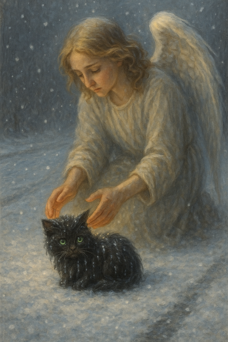 Обычное дежурство, надо следить, чтобы никто не нарушал тонкую ткань судьбы. Вдруг среди снега и мелькающих на дороге машин Ангел почувствовал страх и одиночество живого существа. Посередине заметённой снегом проезжей части лежало что-то тёмное. Когда Ангел подлетел поближе, оказалось, что это маленький пушистый котёнок. Очень замёрзший и испуганный. И никаких следов рядом.