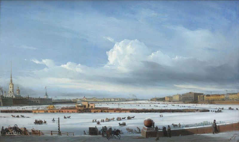 Боголюбов, «Катание на Неве» Катание на Неве — это картина, в которой зимний Петербург замирает и дышит. Боголюбов написал её в 1854 году, но и сейчас она передаёт настоящую атмосферу города — не парадного и музейного, а живого, полного движения и голосов. Это не просто пейзаж с архитектурой Дворцовой набережной и шпилем Петропавловки — это целый фрагмент городской жизни. Художник ловко вплетает в панораму будни петербуржцев: санки и лошадки скользят по льду, люди переходят от берега к берегу, воздух свеж и прозрачен, как в детских воспоминаниях о первой зимней прогулке. Где-то идёт бойкая торговля, звучит смех, вьются облака — и всё это будто затянуто тонкой вуалью морозного света. Боголюбов не просто фиксирует городской сюжет, он смотрит на него с вниманием художника и офицера-флотоводца: море дисциплины и романтики в его живописи. И даже крошечные детали на полотне говорят о его уважении к петербургской жизни — костюмы горожан, очертания домов, изгибы берега. Но самый интересный