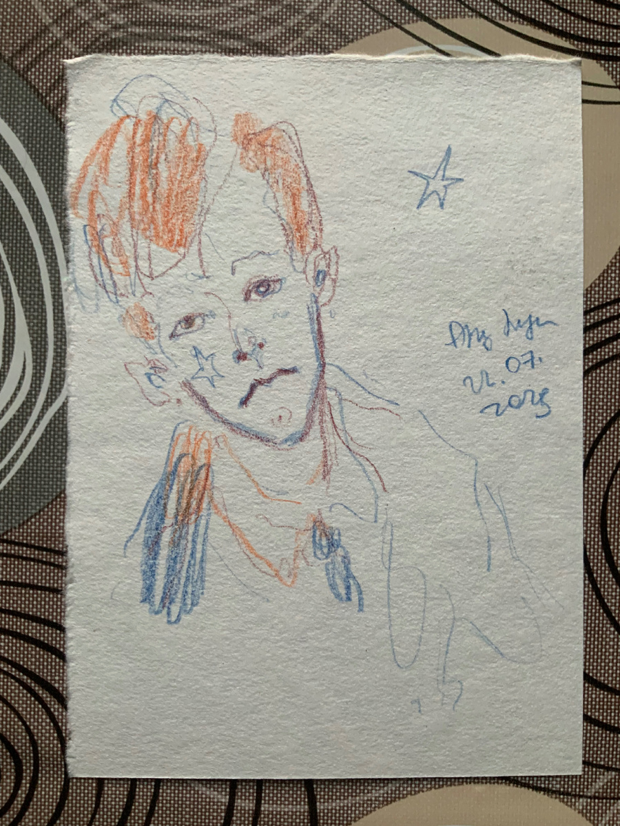 У меня есть еще один портрет артиста Дэвида Боуи в роли инопланетянина, прибывшего на Землю с целью купить воды для своей планеты. Рисунок мне кажется милым. Просто здесь персонаж выглядит уж слишком юным. С другой стороны, может быть, в этом не ничего страшного. Ведь, как я уже писала, Томми в начале фильма очень похож на ребенка по поведению и характеру. И еще мне кажется, что Томми раньше был таким и на своей планете. Может быть, таким как на рисунке. В детстве. Он действительно был инопланетянин-гуманоид. Но на его планете случилась засуха, из-за чего Томми и его сопланетяне вынуждены были адаптироваться к изменениям окружающей среды так, что стали больше похожи на рептилий. Это будет видно по настоящей внешности Томми, когда тот откроет свою тайну. (Эх, тут сложно обойтись без спойлеров.) Ну а когда Томми решил полететь на Землю, чтобы купить воды, он вынужден был «одеться» человеком для Землян, т.е. адаптироваться снова. * Интересно то, что в реальности как раз сам Боуи должен бы