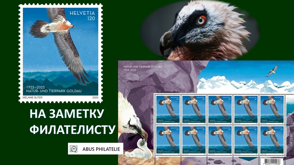 И вот уже бородач вновь парит над Альпами. Его полёт зафиксирован на почтовых марках 2025 года.