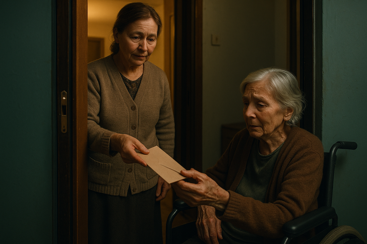 Долгая пауза. Скрип колёсиков. Дверь открывается — и передо мной женщина в инвалидной коляске. Лет под семьдесят, волосы аккуратно уложены, но глаза… Боже, какая в них печаль.