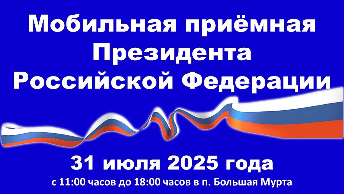 В поселке Большая Мурта будет работать мобильная приемная Президента Российской Федерации 31 июля 2025 года с 11:00 часов до 18:00 часов в п. Большая Мурта Большемуртинского района планируется работа передвижного комплекса мобильной приемной Президента Российской Федерации с целью проведения личного приема граждан в режиме видеоконференцсвязи уполномоченными лицами Администрации Президента Российской Федерации. При личном приеме гражданин предъявляет документ, удостоверяющий его личность. В целях сокращения ожидания личного приема граждан, проводится предварительная запись по телефону 8 (39198)31032, также гражданам рекомендуется заблаговременно подготовить текст обращения в письменном виде. Мероприятие состоится по адресу: п. Большая Мурта, ул. Кирова, 8, администрация Большемуртинского района.