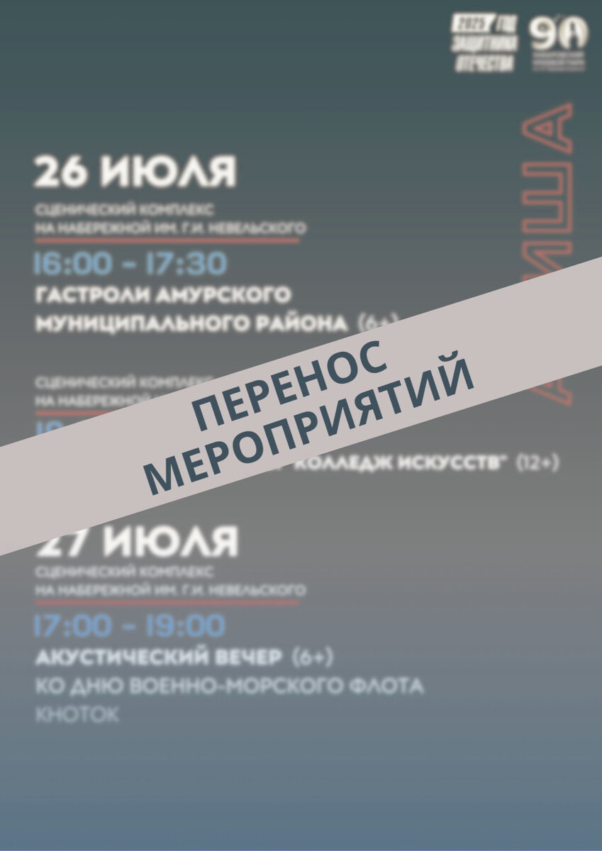 В министерстве культуры Хабаровского края сообщили о том, что в связи с трауром на территории региона отменяются или переносятся развлекательные мероприятия, запланированные на предстоящие выходные. При этом часть информационно-просветительских мероприятий пройдет по плану. ОБНОВЛЕНИЕ 12:47 Как сообщили в руководстве парка имени Муравьева-Амурского, в связи с объявленным трауром, некоторые мероприятия, запланированные на 26 и 27 июля, переносятся. - Следите за нашими новостями, чтобы быть в курсе обновлений, - сообщили в руководстве. День тестирования на вирусы гепатита B и C остаётся без изменений и пройдёт согласно запланированному расписанию — 26 июля. - Информацию о проведении конкретных событий рекомендуем уточнять в учреждениях культуры края, - отметили в ведомстве. Так, например, все развлекательные мероприятия на выходные были отменены в ТРК Brosko Mall. Кроме того отменился праздник красок Холи, приуроченный ко Дню военно-морского флота. Он должен был состояться сегодня у кино