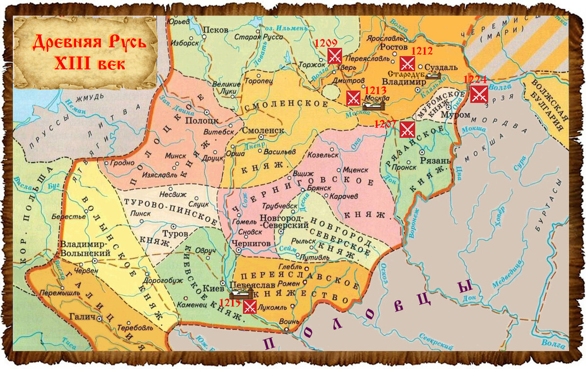 Со времён окончания печенежских набегов на южные русские земли, вдоль границы появился новый кочевой народ - половцы. Не менее опасные по сравнению с печенегами. Как и предшественники, половцы совершали набеги на русские земли, в т.ч. и способствуя миграции населения на северо-восток. Влияние южных земель снижалось. Но в начале 1223 года в половецких землях появились первые монгольские отряды. Половецкие ханы обратились за помощью к русским князьям, сказав: "Сегодня перебьют нас, завтра - вас, если не поможете нам". Понимая, что если не заключить союз с недружественными половцами, то в будущем возможно вторжение монголо-половецких отрядов в пределы Удельной Руси. Главным сторонником похода станет галицкий князь Мстислав Удатный, которому удастся убедить ряд князей выйти на борьбу с неведомым противником. В районе небольшой реки Калка, что впадает в Азовское море, 31 мая 1223 года состоялось кровопролитное сражение, ознаменовавшее первое прямое столкновение русских и монгольских войс