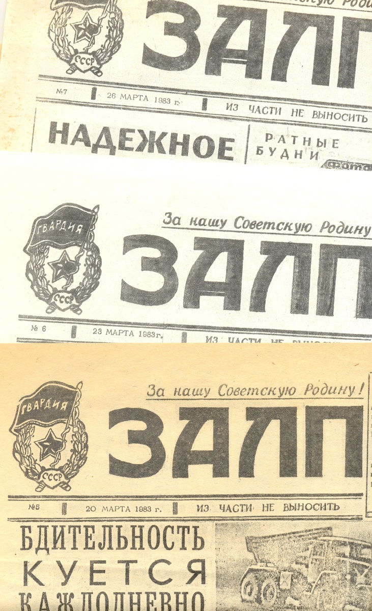 К «Ромайору прилагалось оборудование для копирования и проявления офсетных форм. Макет же, с которого копировались формы, был практически рукодельным и представлял собой лист бумаги, на который наклеивались отпечатанные гранками материалы и вся графика: фотографии, заголовки, линейки, плюс к тому какие-то официальные материалы, вырезанные из центральных газет. Гранки оригинальных материалов, написанных Лёшей и Толей в ходе учений, я набирал на специальной машинке.