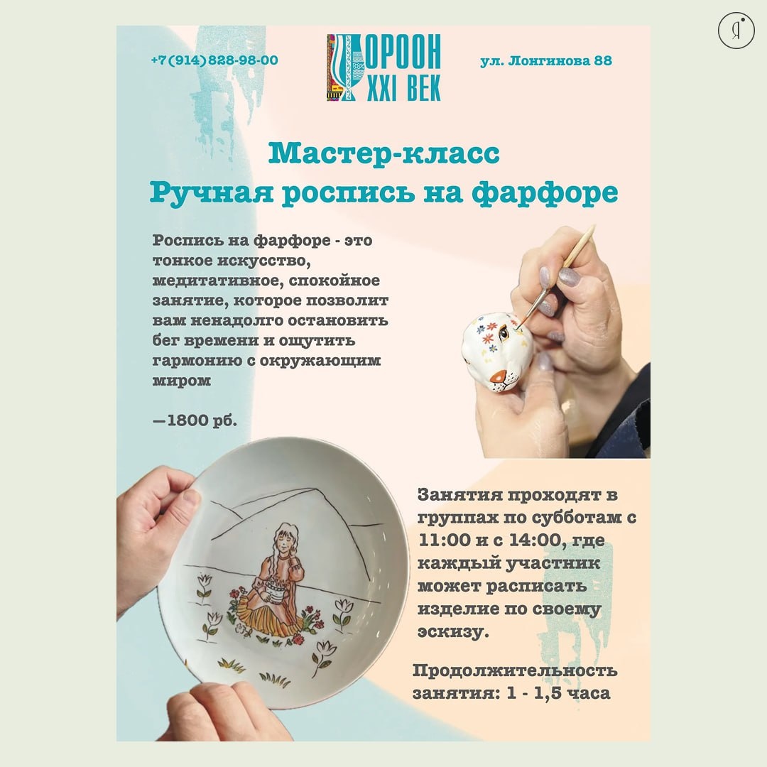 Мастер-класс по росписи на фарфоре #МК Ручная роспись — это тонкое искусство, медитативное и спокойное занятие, которое позволит вам ненадолго остановить бег времени и ощутить гармонию с окружающим миром. Вы создадите свое эксклюзивно расписанное вами фарфоровое изделие, которое станет прекрасным подарком и вечным воспоминанием. После мастер-класса изделие останется для оправки и обжига, который занимает от 7 рабочих дней По субботам | 11:00 | 14:00 Чороон XXI век, Лонгинова, 88 От 1800 руб. +79148289800 Online Якутия | Подписаться