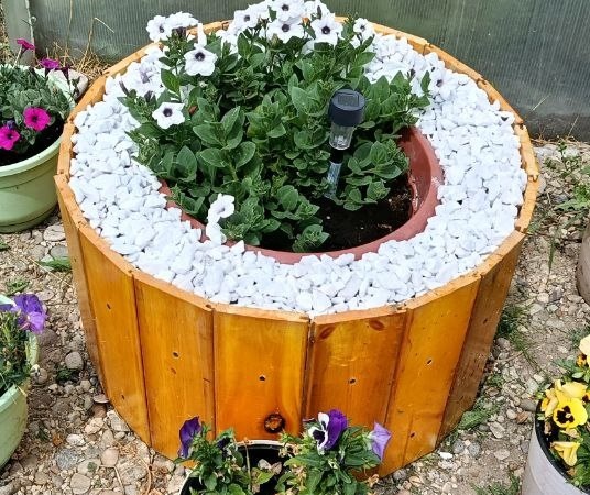 Покрышка — отличный элемент для садовой композиции: прочная, устойчивая, и, что особенно приятно, бесплатная. Мы просто поставили её на выбранное место, внутри разместили горшок с растением. Это помогает поддерживать форму клумбы и удерживает влагу в почве. Чтобы придать эстетичный вид, мы обшили покрышку вертикально установленными досками. Их предварительно отшлифовали и покрыли морилкой яркого солнечного оттенка. Доски крепятся саморезами прямо к шине, формируя стильный деревянный цилиндр. 📸 На первом фото видно, как выглядит заготовка до декора. Вокруг центрального горшка насыпали мраморную крошку — он не только украшает клумбу, но и защищает от сорняков. Добавили солнечный светильник и окружили конструкцию горшками с цветами. Получилась настоящая цветочная композиция! 📸 На втором фото — уже готовый вариант, которым можно гордиться. ✅ Простые материалы