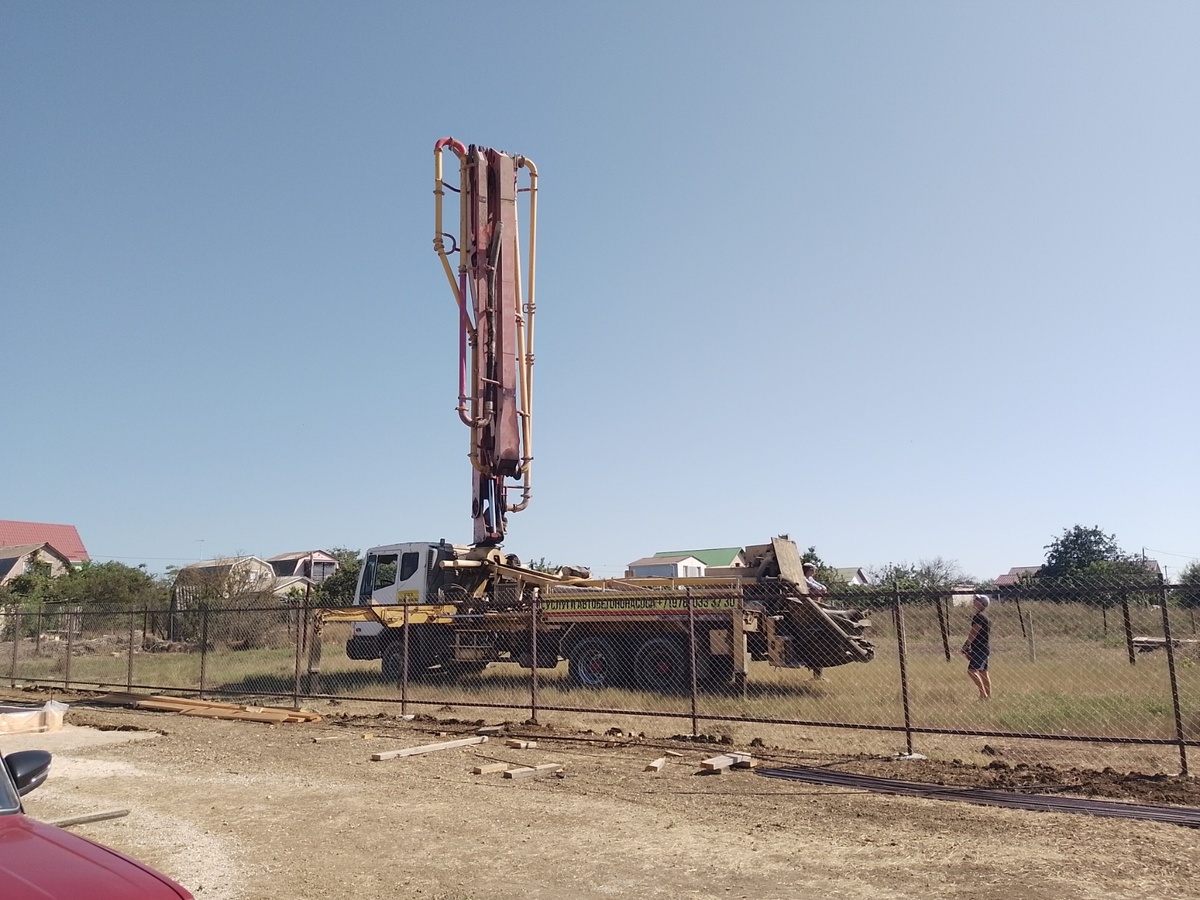 Здравствуйте! Вот и залили плиту. Подумали что вдвоем будет слишком тяжко на такой жаре, так что привлекли еще пару помощников. Бетононасос не подвел, сказал к девяти буду, опоздал всего минут на пятнадцать, но это по Крымским меркам очень хорошо. А вот нам пришлось снять сетку из колючей проволоки на соседнем участке, как ни крути, а двенадцати метровая машина на наших улочках, не смогла вывернуть в четырех метровые ворота. Соседний участок без хозяев, на продаже, так что загнали на него.