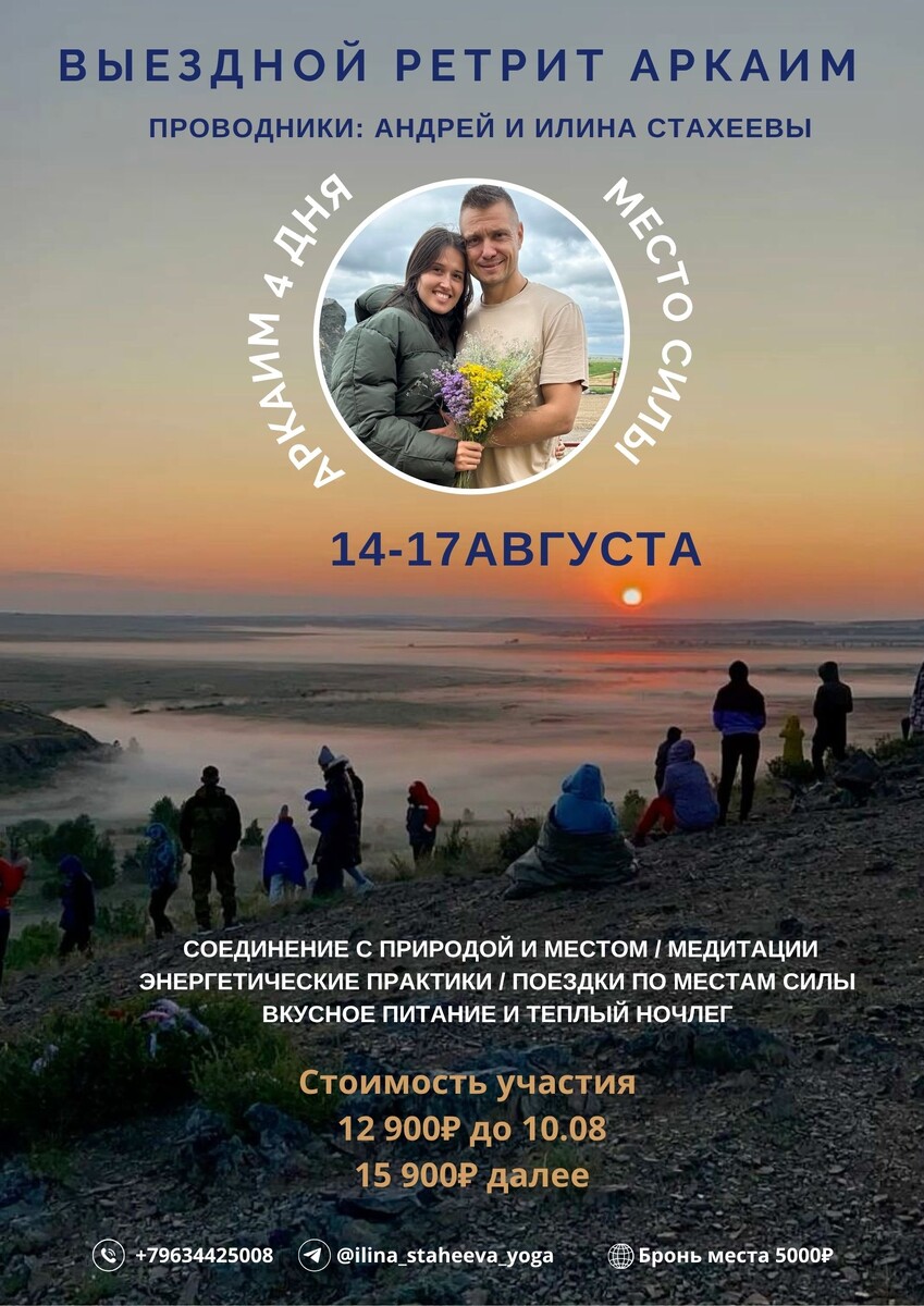 Выездной ретрит Аркаим «ПУТЕШЕСТВИЕ К СЕБЕ!» Аркаим – это не просто древний город, это загадочное и таинственное место силы Говорят, Аркаим – особое место, которое открывается не каждому. Но тем, кто готов к глубокому познанию, он дарит возможность найти ответы на сокровенные вопросы, обрести ясность, наполниться жизненной энергией и достичь внутреннего равновесия Семейная пара энергопрактиков и целителей, Андрей (@staheevandrey) и Илина (@ilina_staheeva_yoga) Стахеевы, приглашают всех желающих присоединиться к ретриту. Они проведут нас через уникальное путешествие К СЕБЕ! В программе ретрита: Даты ретрита: Стоимость участия: 12 900₽ до 10.08 15 900₽ далее Бронь места за 5000₽ по куар-коду 👈 жми сюда Остаток оплачивается за 2 дня до ретрита Дополнительные расходы: Дорога оплачивается отдельно. Бензин на человека 2000₽! Мы отправимся группой на личных автомобилях Есть возможность: По желанию организуем посещение бани за дополнительную стоимость. Погреться и помыться