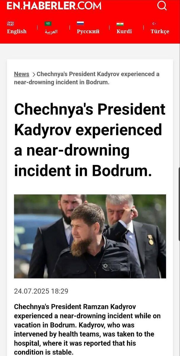 Отдых Рамзана Кадырова в турецком Бодруме едва не обернулся драмой. По сообщениям издания Haberler, глава Чечни оказался в опасной ситуации на воде и чуть не утонул. Среагировали быстро: местные врачи сообщили, что состояние пациента стабильное, и угрозы для жизни нет. В итоге всё закончилось благополучно. Кадырова уже выписали из больницы, и он продолжает свой отдых.