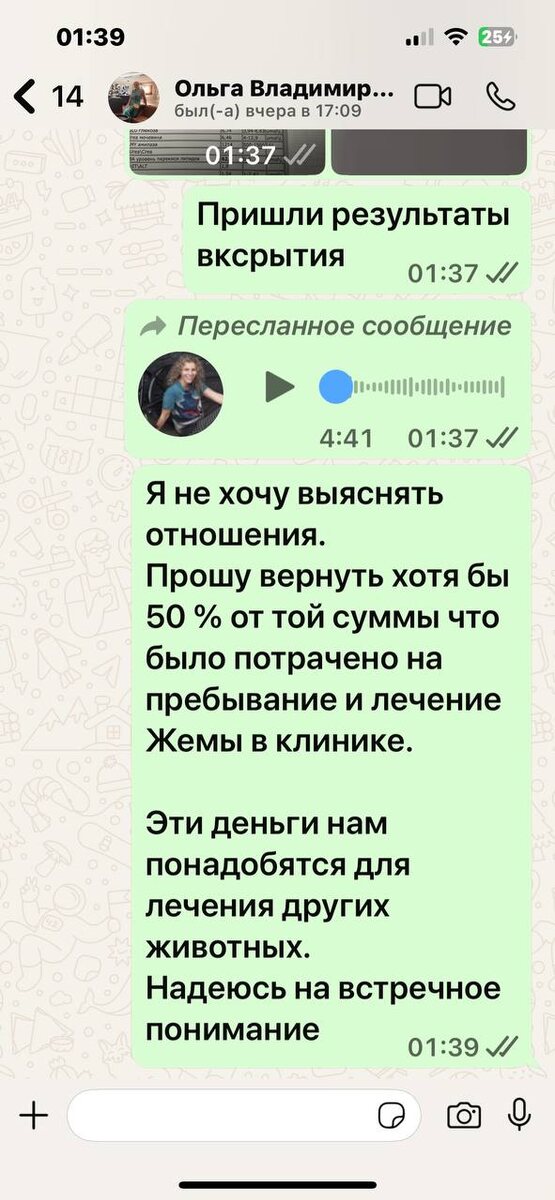 Друзья, результаты вскрытия Жемы готовы . Можете ознакомиться с ними. Мы попросили прокомментировать врача простыми словами результат, Юля мне прислала голосовое смс ( публикую ниже ) Я все отправила главному врачу клиники Сова и прикрепляю мой комментарий! Ждём ответ.