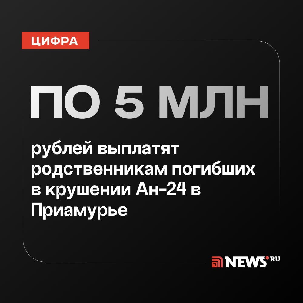 В ответ на пост В Амурской области выплатят компенсации семьям жертв авиакатастрофы с Ан-24. Всего им выдадут по 5 млн рублей: 2 млн 25 тыс. рублей — от страховой компании; 2 млн рублей — помощь перевозчика, 1 млн рублей — материальная помощь региональных правительств. В Минтрансе добавили, что на месте катастрофы обнаружены бортовые самописцы. В ближайшее время их доставят в Москву для расшифровки. ⭕ Подписаться | Прислать новость | Буст