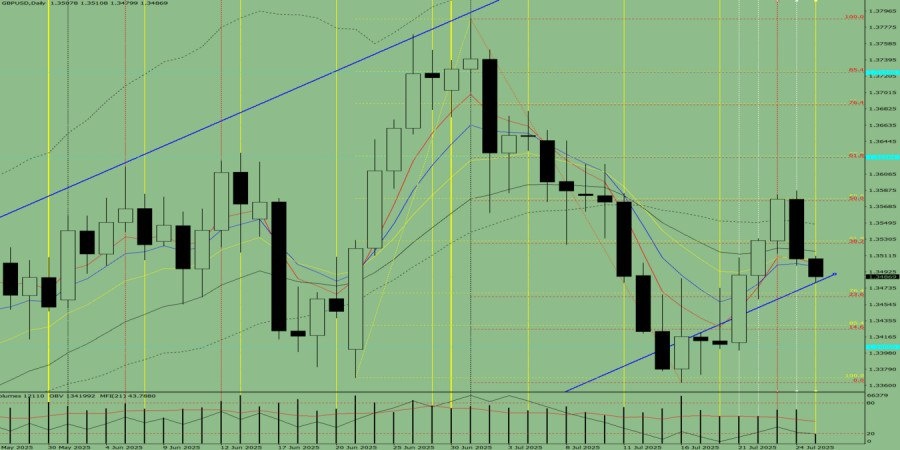 Альтернативный сценарий: цена от уровня 1.3508 (закрытие вчерашней дневной свечи), может продолжить движение вниз, с целью 1.3468 – откатный уровень 61.8% (жёлтая пунктирная линия).