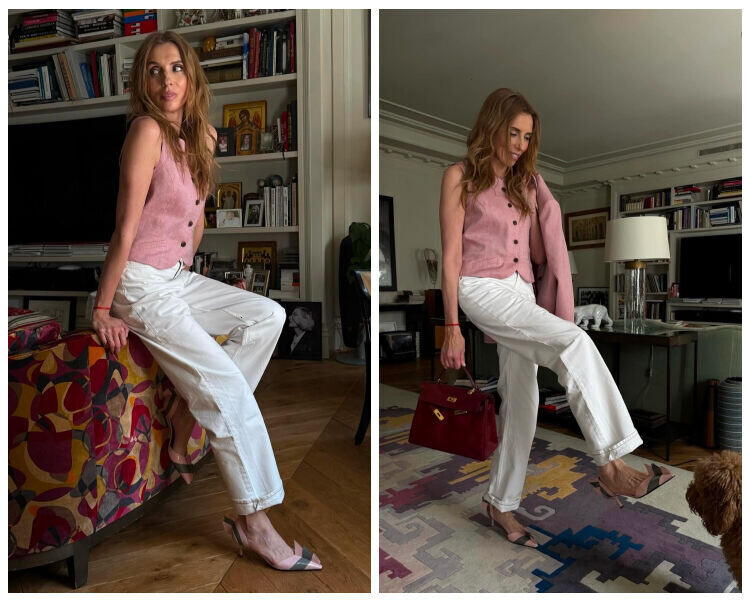 Сочетание светлого денима и нежно-розового верха — проверенная формула летнего гардероба. Эти оттенки работают на освежение и визуально «охлаждают» в жару. Лаконичный крой жилета делает акцент на фигуре, но без излишней строгости. Свободные джинсы добавляют расслабленности, а туфли и сумка выводят комплект на уровень «городского шика».